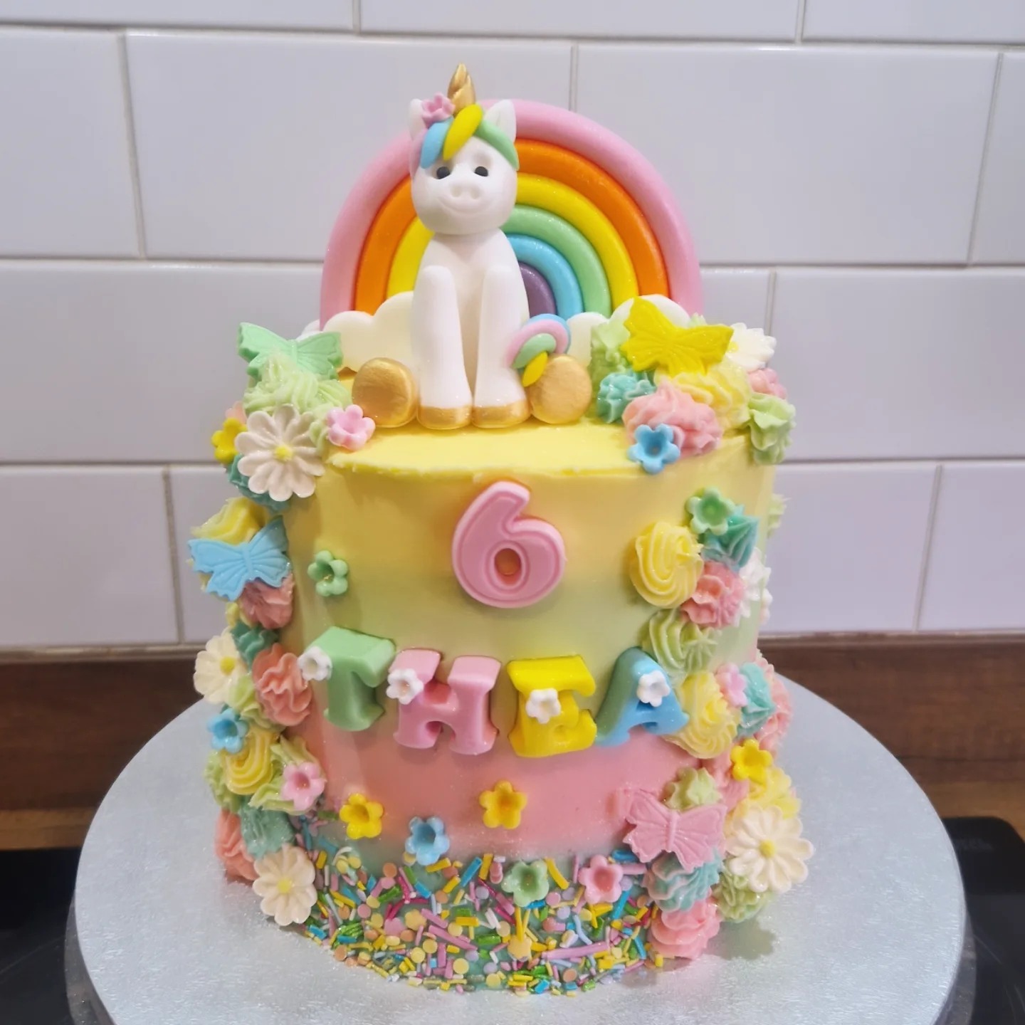 This was a multi-layer chocolate cake with an inner chocolate butter frosting, four tone ombre butter exterior in blue, pink, green and yellow with confetti unicorn sprinkles around the base and fondant unicorn and rainbow topper with butterflies and flowers